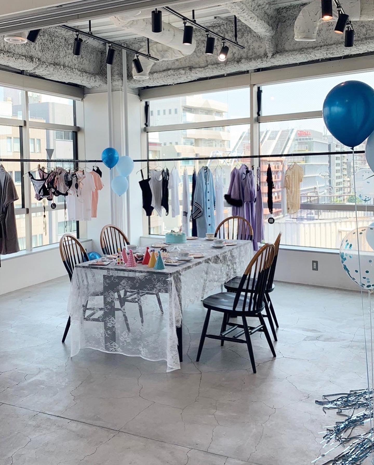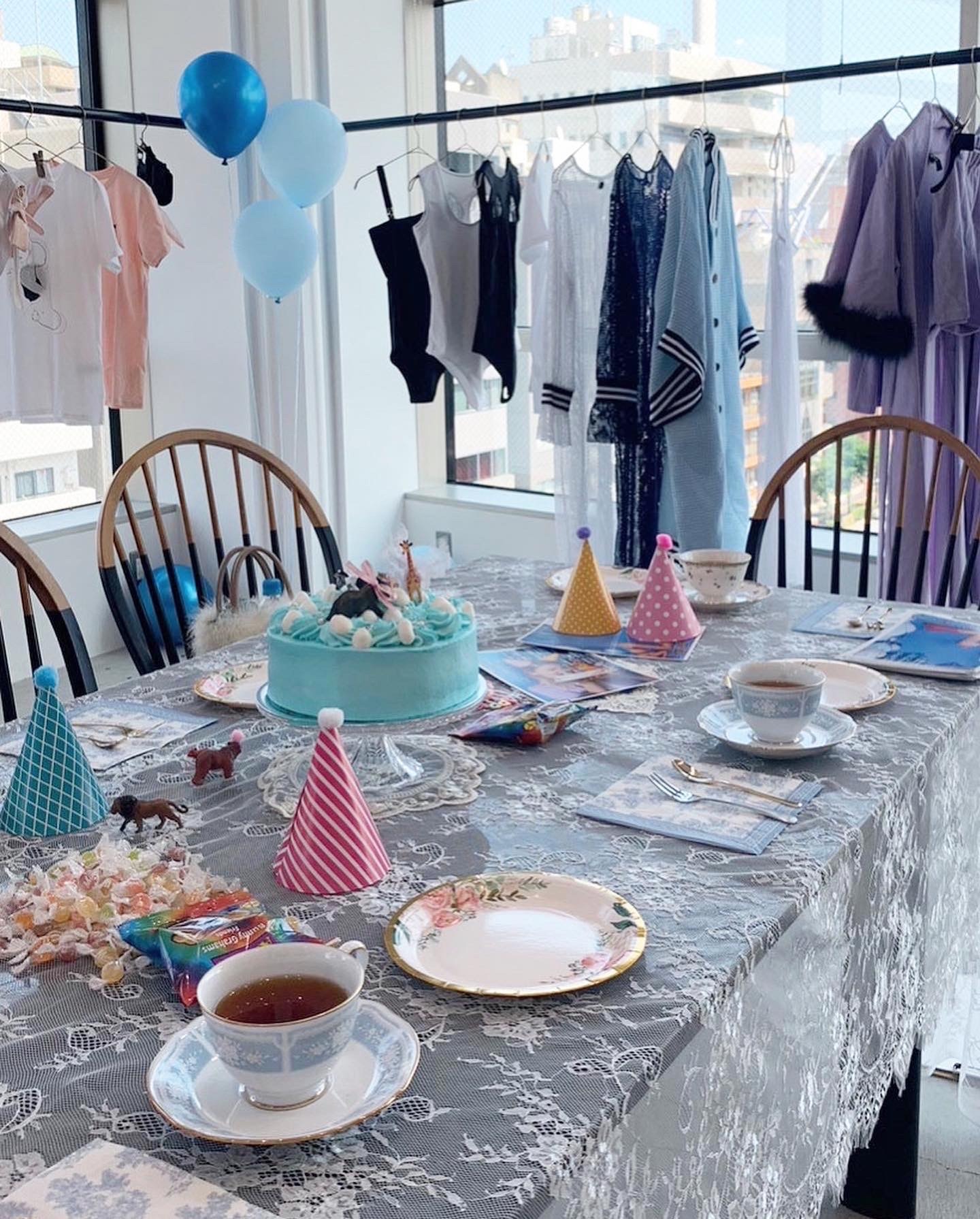 Kriss Soonik Japanお茶会を開催しました☕️✨春夏コレクションのテーマでもあるブルーを基調としたKids Garden Birthday Partyを再現するべく、ブルーのバルーンやケーキをご用意🎂🩵