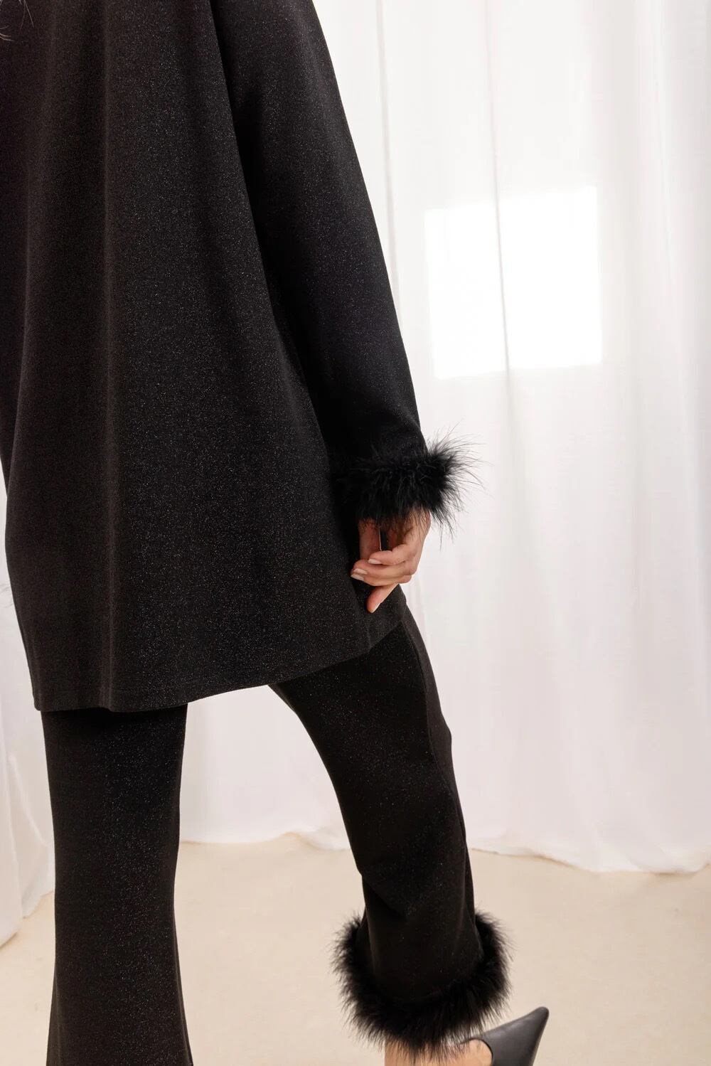 ブラックの光沢のあるジャージー素材を使用した長袖トップスで、袖には取り外し可能なマラボートリムが付いています。 素材:レーヨン41%、ポリアミド31%、エラスタン6%、メタリック糸22% 洗濯:30°Cで洗濯機洗い可(洗濯前にマラボートリムを取り外してください) エストニア製