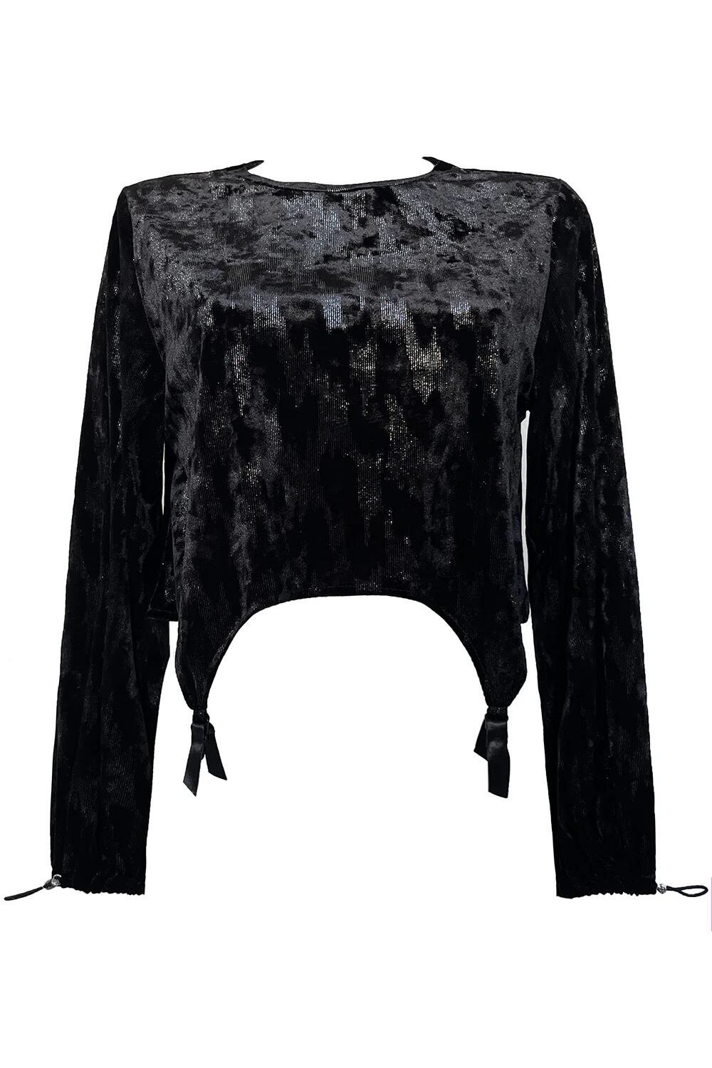 シグネチャーのベロアサスペンダートップを、ショート丈のクロップドスタイルと長いパフスリーブで仕上げたデザインです。生地は「ボウイベルベット」と呼ばれ、ブラックベルベットにシルバーの稲妻柄が入った、ロックンロールな雰囲気の素材です。 パフスリーブには、メタルストッパーで調節できるスポーティーな伸縮ディテールがあります。 ブラックサテンで覆われたサスペンダーディテール ブラック&シルバーのメタルパーツ 素材:ポリエステル90%、エラスタン10% 手洗いのみ エストニア製
