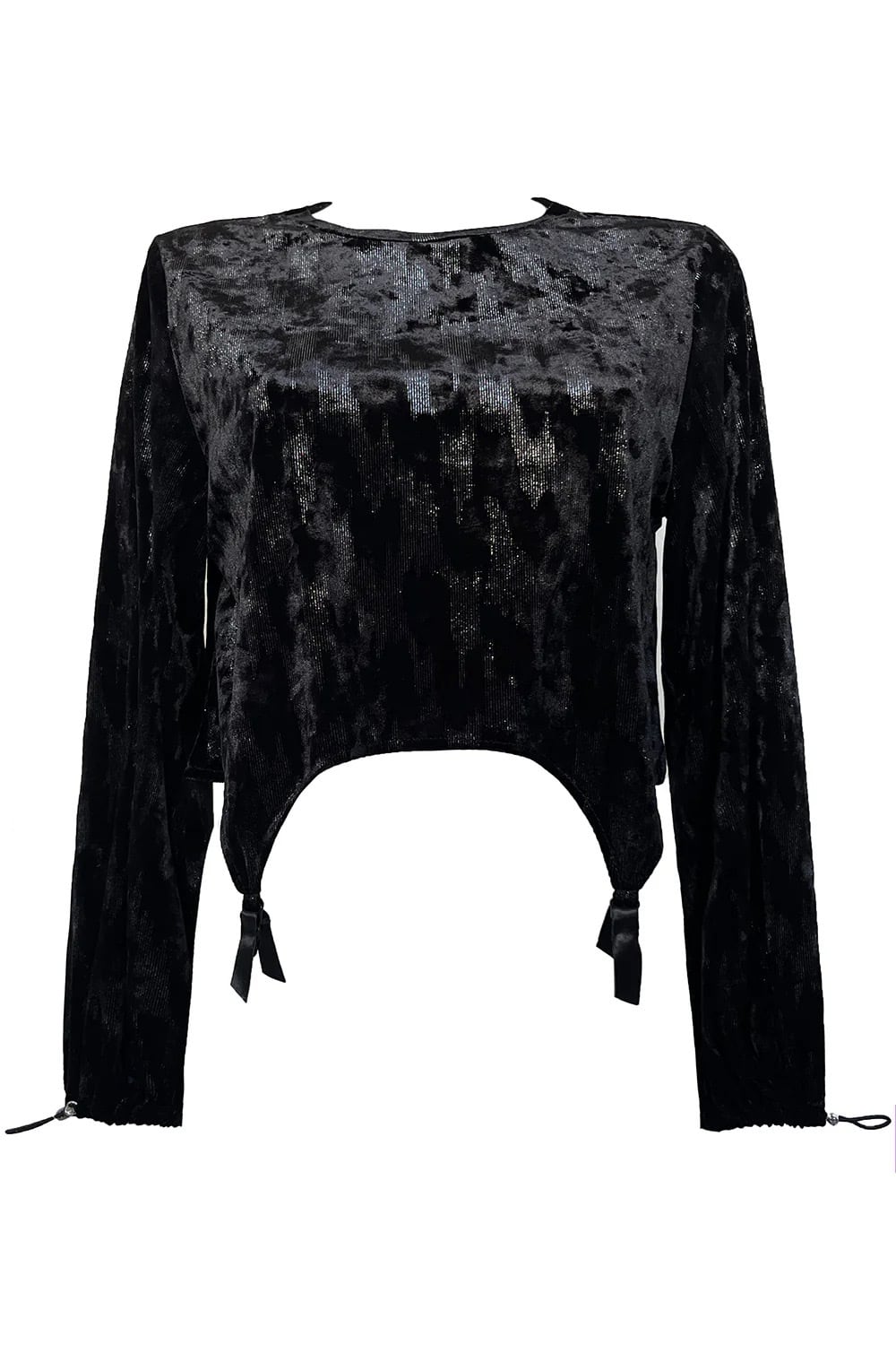 ショート丈にアレンジされた、ベルベット素材のシグネチャーサスペンダートップ。