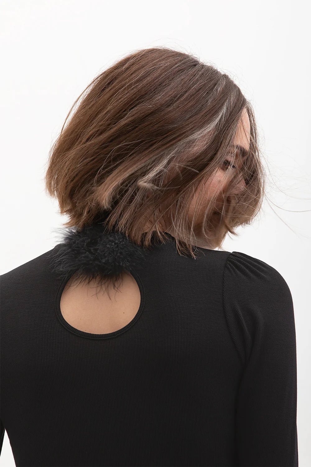 キーホールディテールには、取り外し可能なマラブーファーのパフが付いています。
