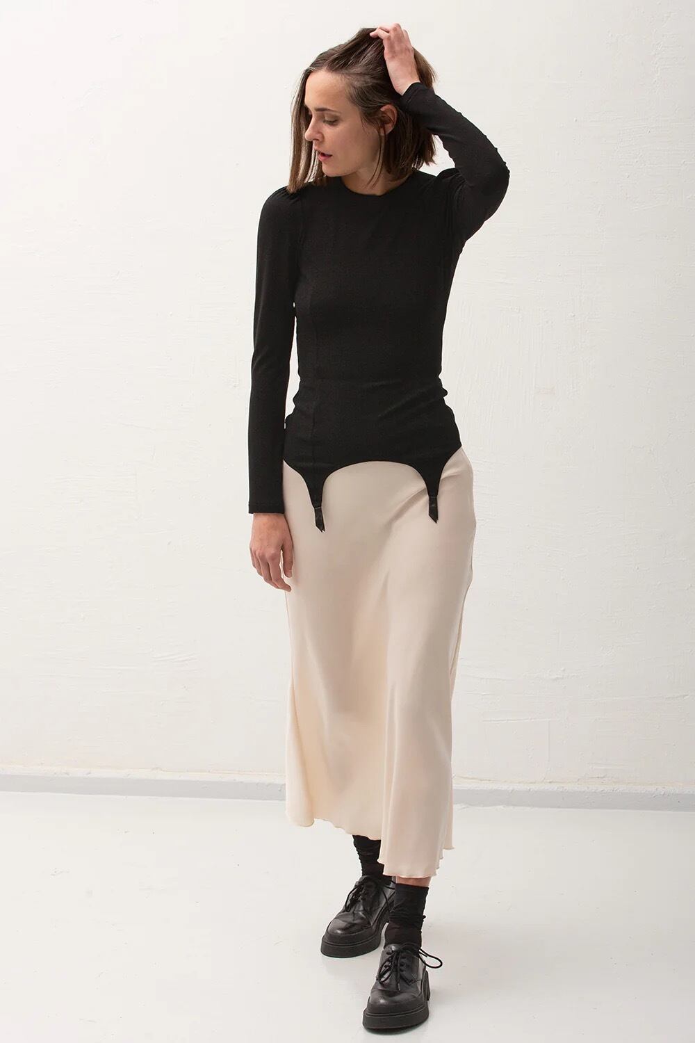 ウエスト部分はゴム仕様で、女性らしいくびれのあるシルエットを美しく引き立てます。