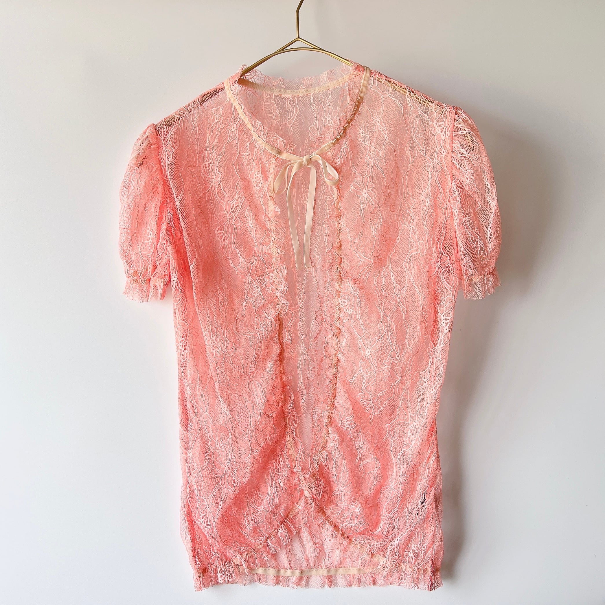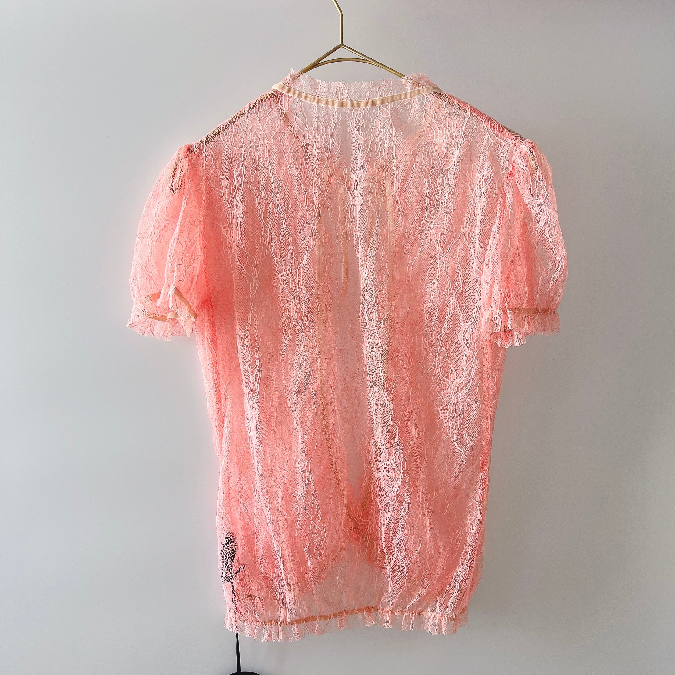 やわらかなピンクカラーの総レーストップス。